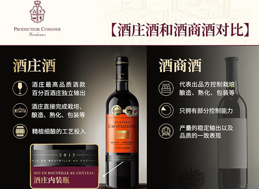 酿酒师VincentCachau:酒商酒和酒庄酒一字之差,但这两者的品质差别就好比五星级酒店和快捷酒店。葡萄酒的品质讲究七分原料、三分酿造,酒商酒都是靠收购葡萄或者葡萄汁去调配出成品酒,原料来源是最差一级的,也没什么酿造技术可言。而酒庄酒从葡萄的管理、采收、酿造、装瓶全部都在酒庄完成,就是为了每一个环节都能控制品质。在口感上,酒商酒一般只做低级的饮料酒,真正要喝懂、会喝、有档次,还是要选酒庄酒。
