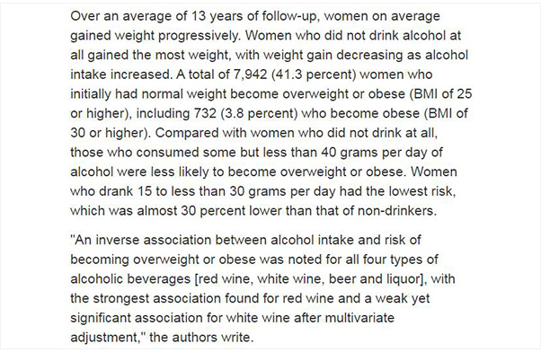 美国《内科学文献》Archives of Internal Medicine上刊登的一项研究,针对近2万名美国女性,经过了13年的跟踪调查发现,经常适量喝点红酒的女性,相比滴酒不沾的女性,更不容易增加体重。换句话来说,喝红酒不但不会变胖,反而有减肥的功能。