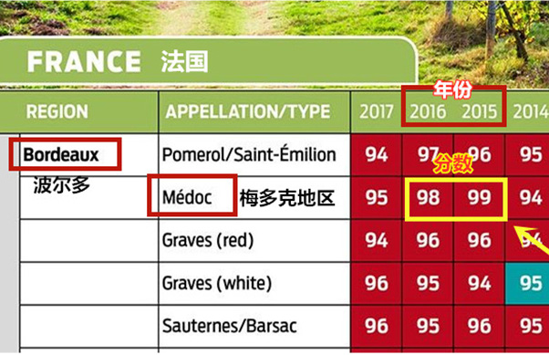 可以看到,2015年是法国波尔多梅多克地区的一个经典大年份,达到99的高分,这一年的四季气候非常适合葡萄生长,日照雨量充沛,温度适宜,该冷的时候冷,该热的时候热,该下雨的时候下雨,不该下雨的时候没有乱下雨。特别是采收的季节,秋高气爽天气干燥,葡萄成熟度高,糖分含量也表现优异。像来自我们康曼笛酒庄的佳酿卡萨图就是用2015年采收的葡萄所酿出的杰作,她甜酸适度、单宁柔滑、口感醇厚、香气甜美,各方面都达到令极度舒适的平衡状态,回味悠长、滋味诱人,是不逞多让的好酒。