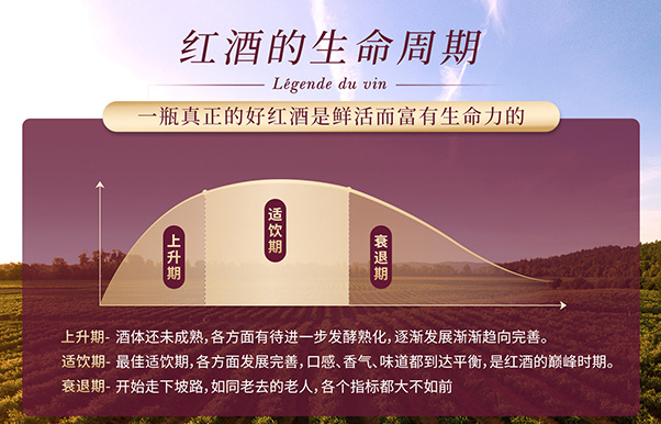 不管是新酒还是陈年酒,在装瓶后,都有一个完整的生命周期,包括,上升期、适饮期、衰退期三个阶段。