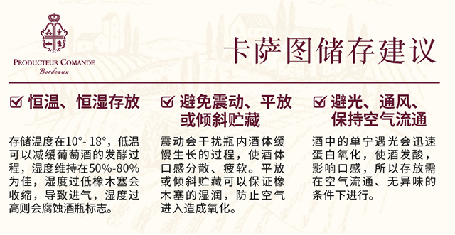 2015年份的卡萨图适合现在饮用,也可以在10年内饮用。很多朋友不免会产生疑问:怎么样更好地保存葡萄酒?我们建议酒瓶避光斜放或横卧摆放,以便酒液与木塞接触,保持橡木塞的湿润以防止老化;理想的储藏温度在10-16度,湿度约在60%-75%;避免与有异味的物品放置在一起,以免影响卡萨图的香气。
