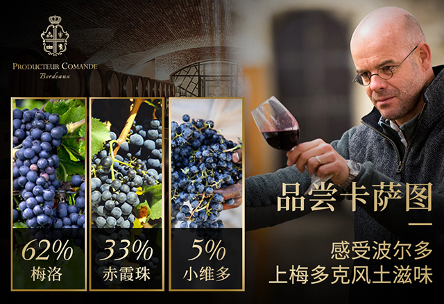 而为什么要用不同葡萄去进行混酿,也和波尔多的气候息息相关。波尔多属于温带海洋性气候,受大西洋的影响较大,天气变化多端,会在很大程度上影响葡萄的产量和质量。为了最大限度地减少不利影响,法律允许酒庄使用某些葡萄进行混酿,如果某一年某种葡萄的收成不好,可以适当降低其比例,提高其他葡萄的比例,能保持不同年份葡萄酒的稳定发挥和品质。卡萨图酒款经过Vincent Cachau无数次的尝试,找到了最适合卡萨图的黄金混酿比例:以62%梅洛为主,加入33%赤霞珠以及5%小维多,不同的葡萄品种相得益彰,甜美之中带有结构感,柔中带刚,完美融合。